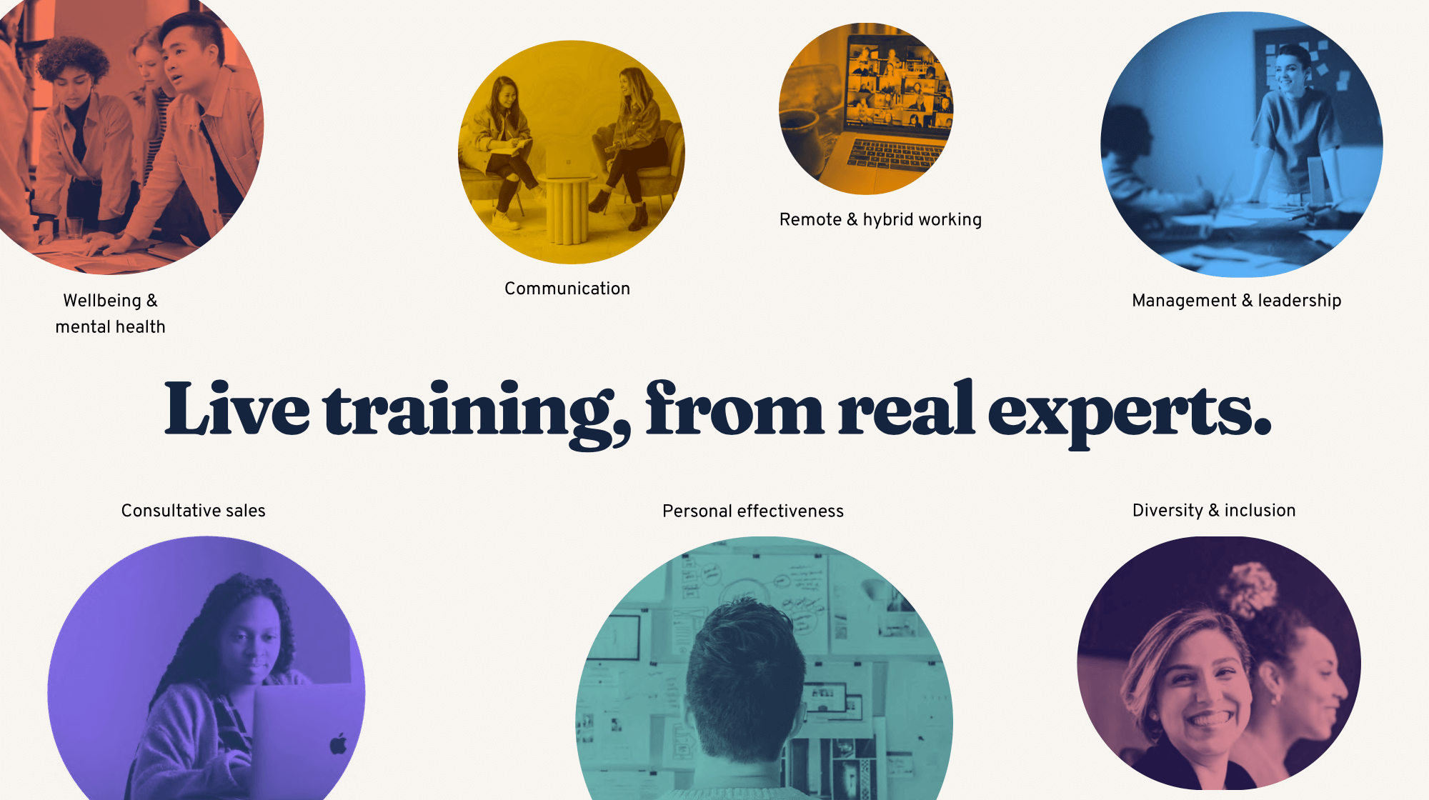 We use a ‘duotone’ colour treatment on stock photos, based on our brand rainbow, to create a more distinctive look and flatten the internal contrast of the image, in turn making our Fraunces headlines ‘pop’. Each of our training course categories has its own corresponding colour, from wellbeing to leadership.